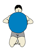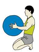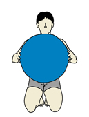 フロアに膝まづいて両手でボールを挟み、胸の前で構える。 注意)手の平は横から見た時にボールの中央部に位置させること。 |