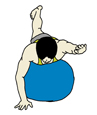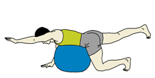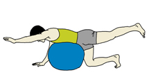 スタートの状態から同じ側の手と足を伸ばしていく。 対角線(ダイアゴナル)に伸ばすよりは多少バランスを取っていかなければならないが、ボールで体を支えているので、バランスを崩して倒れてしまうほどではないから、しっかりと伸ばすことに意識を集中すること。 |