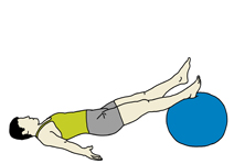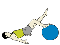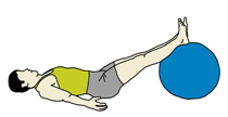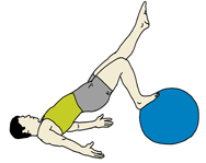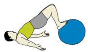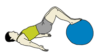 腰をフロアから浮かせながらボールを手前にローリングさせ、肩から膝までのラインを直線にする。 このとき、息を吐きながら動作を行う。腰はなるべく落とさないようにする。 まずは1セット(10回)がしっかりとできるようにする。(片足の場合は、それぞれ5回ずつ)余裕が出てきたら、2から3セットを目標とする。 |