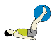 左右に交互にボールをツイストしていく。 このときツイストの動作につられて腰が大きくフロアから離れないようにする。1セット(左右それぞれ10回ずつ)がまず一つの目安で、余裕があるようであればセット数を増やしていく。 |