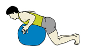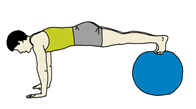 ボールをローリングさせながら太ももあたりまで移動させ、両手をフロアにつく。ボールの大きさにもよるが、ほぼ体はフロアと平行になりスタートの体勢となる。腕の幅は肩幅よりも広く取る。 ボールの位置で強度の調節が可能。ボールを胸から離せば離すほ運動強度は高くなる。 |