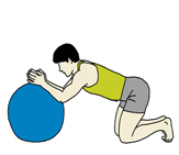 肘でボールを前にローリングさせながら膝を伸ばしていく。このとき、息を吐きながら行う。 膝の伸ばし方で強度の調節ができるので、無理のないところから始めること。まずは回数を気にせずしっかりとしたフォームで行えることが大切。動作に慣れてきたら1セット(10回)を目標とし、余裕がでてきたらセット数を増やしていく。 注意)腰はなるべく反らないようにすること。 |