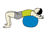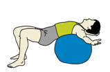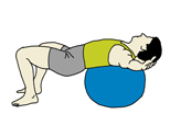 ボールを左右へローリングさせていく。 小さな動きから始め、少しずつ大きくしていく。左右にローリングさせた時に体勢が崩れないように、足でしっかりとフロアを踏ん張っていく。10回で1セットを目標とし、余裕が出てきたらセット数を増やしていく。 注意)腰が反ってしまうと腰痛の原因になるのでなるべく落とさないようにする。 |