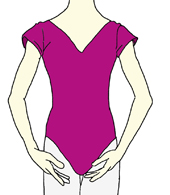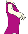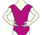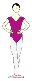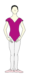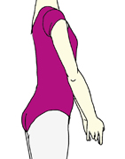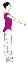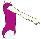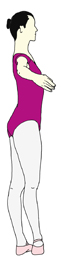 アン・バーから腕を少し持ち上げた形 ・アン・バーのときの卵形の円の形を維持しながら、指先がみぞおちの高さ位になるようにもちあげていく。 ・横から見たときに、肩-肘-指先のラインが緩やかな下降線を描くようにし、肘が持ち上がらない(=脇を大きく開いてしまわない)ように注意する。 ・両手の指先の間隔はアン・バーのときの間隔を維持する。(開きがちになるので注意する) |