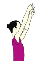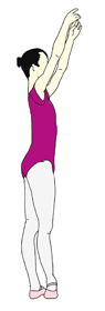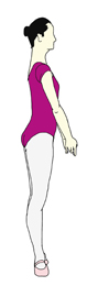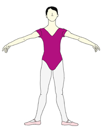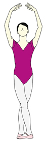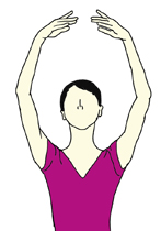 両腕を一番高く持ち上げた形 ・両腕はアン・バーの卵形と同じ形を取る。 ・横から見たときに肘は体の中心線よりも前に置き、顔を正面に向けたまま見上げたときに、指先が視界に ギリギリに入るようにする。 ・両肩はしっかりと下げておく。 (4種類の腕のポジションの中では、慣れるまでは一番気を使っていかなければならない形だと思います。知らないと腕を真上に上げてしまいますし、腕を上げながら肩を下げていくという動作は、背中の筋肉(広背筋、大円筋など)をしっかりと使っていかなければなりません。 |