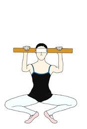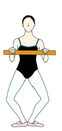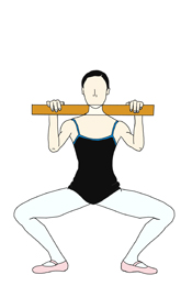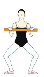 ドゥミ・プリエ ・重心を前後の足の真ん中に保ったまま膝を曲げていく。 ・このとき、必ず膝とつま先は同じ方向を向けておく。 ・上半身はフロアに対してまっすぐに保つ。 膝を曲げるに従って、お尻を後ろに引き上半身が倒れやすくなるので注意する。 |