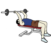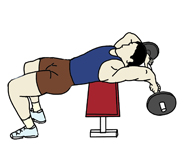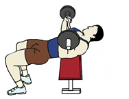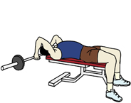 ・息を吸いながら肘を少しずつ曲げ、バーベルを頭を越えて下ろしていく。そして、息を吐き肘を伸 ばしながら、再びスタートの位置まで上げていく。 ・どこまでバーベルを下ろしていくかで運動強度の調節が可能。肩の柔軟性にもよるが、可能であれ ば、バーのラインが頭よりも下(目安)に来るように下ろしていく。また、下ろし過ぎると、少な からず肩に負担がかかるので注意していきたい。 ・ベンチと腰の間にアーチができて腰に負担がかかる場合は、足を上げる。⇒イラスト・動画 ・下ろす時も勢いよく下ろさずに、なるべくダンベルの重さに抵抗するように下ろすこと。 ・目標回数:10回から15回を1セットとし、2セットから3セットが目標セット数 |