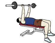 ・ベンチに仰向けになり、バーベルを持った手を天井の方に伸ばしていく。 ・このとき、肘はピンと張ってロックさせずに気持ち曲げておく。 |