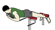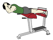・息を吐きながら上半身を起こしていく。どこまで上げていくかで運動強度の調節ができる。上げれば上げるほど運動強度は上がるが、上げすぎて腰を反らしてしまうと腰を痛める原因にもなるので、身体のラインが一直線になるのが一つの目安となる。 ・戻す時も勢いよく戻さずに、なるべく身体の重さに抵抗するように戻していく。 ・目標回数:10回から15回を1セットとし、2セットから3セットが目標セット数 |