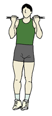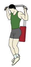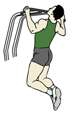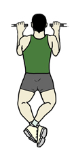 通常のグリップで グリップ幅が異なるだけで、基本的な動作の仕方は最初のワイドグリップの場合と同じ。イラストは足を交差させているが、個人個人やりやすい形を取ればよい。 |