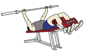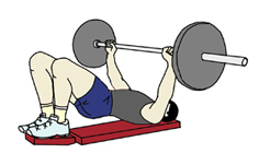 ・息を吸いながら、バーをそのまままっすぐ下に下ろし、そして、息を吐きながら、再びバーをスタ ートの高さまで上げていく。 ・どこまで下ろすかで運動強度の調節が可能。もちろん、いろいろなやり方があるが、重いウエイト で途中で止めるのであれば、しっかりと胸につくかつかないかくらいまで下ろすことができる重さ にして、肩関節を大きく動かしていく方が良い。 ・下ろす時は、勢いよく下ろさずに、なるべくバーベルの重さに抵抗するように下ろし、上げるとき は胸でバーをバウンドさせて勢いをつけずに上げていく。基本的には、下ろす時も上げる時も同じ カウントで行っていく。 ・目標回数:10回から15回を1セットとし、2セットから3セットが目標セット数 |