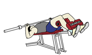 | 下のディクライン専用のベンチを使うか、「スミスマシーン+ディクラインベンチ」、または、フラットなベンチでも、ショルダーブリッジをすることによってディクラインベンチプレスをすることができます。