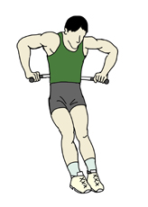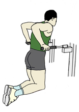ジロンダディップス 肘を左右に開くディップス、グリップの仕方も通常のものとは異なり、自分から見て、指が内側に来るようにハンドルを握っていく。 |