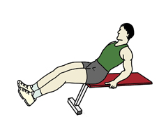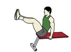 ・ベンチの端に腰を下ろし、それぞれの手でベンチの縁をつかんで身体を安定させ、足を伸ばしていく。