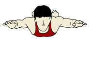 息を吐きながら、上半身をフロアから浮かせていく。このとき、「反らす」というよりは、両手を斜め上方に伸ばしていくようにな気持ちで持ち上げていく。 上げきった時にしばらく同じ姿勢を維持すると、筋肉により強い刺激を与えることができる。腰に違和感を覚えるようであれば、無理をしないこと。 回数:10回から15回を1セットとし、1回から3回が目標セット数となる。 |