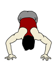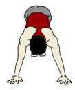 通常のプッシュアップの形から、かかとをフロアから離しお尻を持ち上げて構える。 背筋はまっすぐに保ち、視線は手と手の中間あたりのフロアに向ける。 |