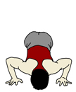 | フロアに対して上半身を傾斜させた(お尻が上で頭が下)プッシュアップになります。本来ならば、ベンチ台やイスなどの段差を利用して行えればより効果的に行えるのですが、この「ボディウエイト・エクササイズ」の項では用具はなにも用いないで行うことにしていますので、この形になりました。