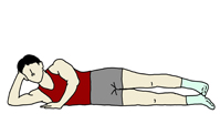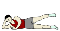 フロアに一方の足を下にして横になる。真上から見た時に体のラインが一直線になるようにする。 一例として、下の手は肘を曲げて手で頭を支えてみたが、伸ばして頭を寝かせても良い。上の手はフロアを押さえ、体の安定を取る。 |
