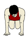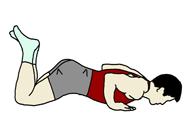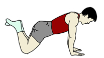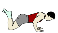 よく女性などが通常の膝を伸ばしたプッシュアップができなくて、膝をつけて行っているのを見かけたりしますが、それとは全く異なります。 あえて膝をつけて行います。目的は上腕三頭筋を鍛えることにあります。 体を持ち上げると言うよりは、肘を開閉することに意識を集中して下さい。そうすればほとんど大胸筋は使わずに、上腕三頭筋にだけに刺激を与えることができます。最初のうちはなかなか難しいかもしれませんが、やっているうちにだんだん意識できるようになってきます。 |