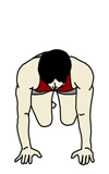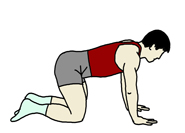 フロアに四つん這いになる。 腕や大腿部は、フロアに対してだいたい垂直になるようにする。 背筋をまっすぐ伸ばし、視線は、真下か気持ち斜め前方のフロアに落とす。 |
