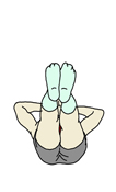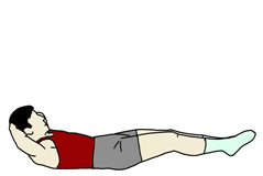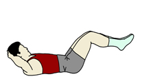 ・フロアに仰向けになり、足を上げていく。 ・膝は、可能ならばなるべくまっすぐにする。 ・手の位置にはいくつかあるが、ここでは後頭部に軽く添えてみた。(その他に、手 の平を下にして、脇を少し開いてフロアにつける方法もある) ・また、足を下ろすときに腰が浮いてしまって痛みを覚える場合は、右のイラストの ように、お尻の下に手の平を重ねて敷く。 |
