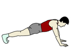 少し手を前に出したプッシュアップで構える。 腹筋をしっかり締めて頭からかかとまではまっすぐに保つ。 |