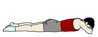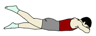 フロアにうつ伏せになる。 手はやりやすい位置でよい。一例として額の下で両手の手の平を重ねてみた。 |