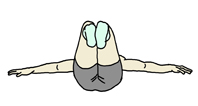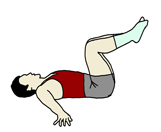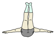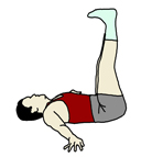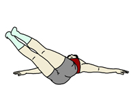 フロアに仰向けになり、足を上げていく。(可能であれば膝をまっすぐ伸ばすが、太ももの裏が張る場合は調節をする。) 手は、手の平を下にして、左右に広げて体を支えていく。 |