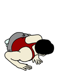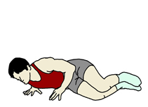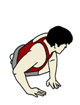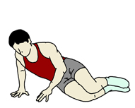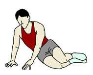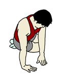 正座を崩した形(?)になる。イラスト参照。 フロア側の手の手の平をしっかりとフロアにつける。このとき、指先は、体に対して真正面、または気持ち外側に向けておく。 もう一方の手もフロアに軽く着いておく。(運動強度を強めたい場合は、全く着く必要はない) |