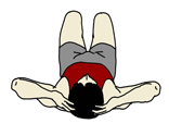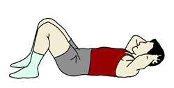 フロアに仰向けになり膝を立てる。手は、肘を開いて軽く後頭部に添えておく(一例)。足の幅や膝の角度はそれほど気にする必要はないように思われ、自分がやりやすいと思う幅や角度で構わない。頭はフロアから少し浮かしておくとよい。 |