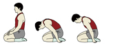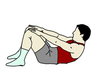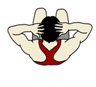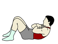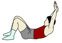 勢いをつけずに、息を吐きながら上半身を持ち上げていく。肘はなるべく最初の開いた状態を維持しておく。このとき、視線は、上げるよりは下腹部あたりに落とした方がより腹筋の収縮が意識できる 基本的には、上げるときと同じカウントで下げていく。(上げ下げするカウントが違うパターンもある) (回数)1セットを10回から15回とし、1セットから3セットを目標とするようにする。 |