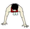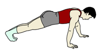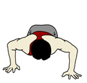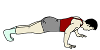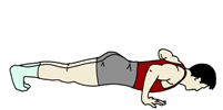 呼吸は下げるときに吸い、上げるときに吐いていく。また、頭からかかとまでは常に直線に保っていく。 同じ手の形で繰り返して行ったり、入れ換えて交互に行ったりする方法もある。 基本的に「下げる・上げる」は同じカウントで行うが、左右交互に行う場合は、上げるときには少し勢いをつける必要があると思われる。(左右の入れ換え方にもよる) 回数:10回から15回を1セットとし、1セットから3セットが目標セット数。 |