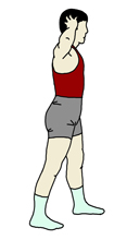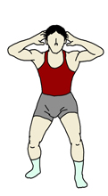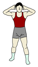足を前後にずらして立つ。 どれだけずらすかは各人が調節していくこと。ここでは、後ろ足の指先が前の足のかかとくらいになるようにしてみた。 手もやりやすい位置で構わないと思われる。ここでは一例として、後頭部に軽く添えてみた。 |