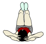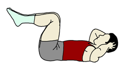 フロアに仰向けになり、膝はだいたい90度に曲げ、大腿部がフロアに対して垂直になるように足を持ち上げる。手は、肘を開いて軽く後頭部に添えておく(一例)。頭はフロアから少し浮かしておくとよい。 |