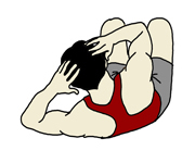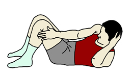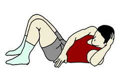 息を吐きながら、肘を膝に近づけるように上半身をひねりながら上げていく。 また、やり方としては、一度上げきってからひねると言う方法もある。 基本的には、上げるときと同じカウントで下げていく。 (回数)1セットを10回から15回とし、1セットから3セットを目標とするようにする。 |