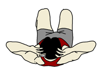 フロアに仰向けになり膝を立てる。手は、肘を開いて軽く後頭部に添えておく(一例)。足の幅や膝の角度はそれほど気にする必要はないように思われ、自分がやりやすいと思う幅や角度で構わない。頭はフロアから少し浮かしておくとよい。 |