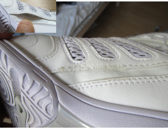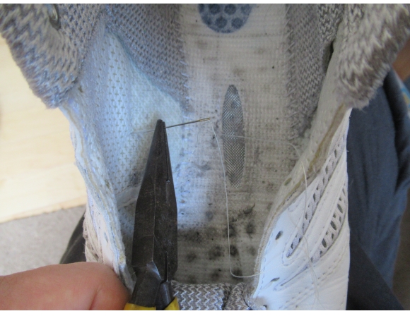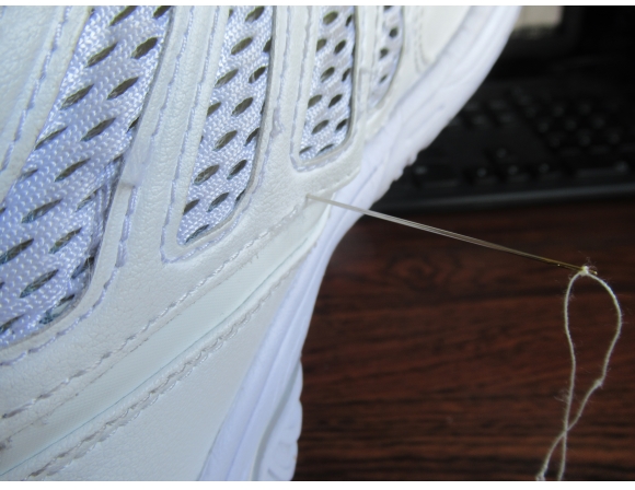 いや〜、久し振りの手縫いである。もう1年以上は糸や針などは手にしていないような気がする。まあ、「きれいに縫おう!」などと言う気は毛頭ないし、そんな技術もなし。それに、使う針や糸は一般裁縫用なので「シューズを縫ってどれくらい持つだろうか?」という不安もあり、「ダメ元」感は強い。