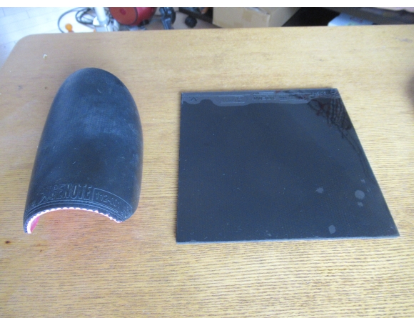 そこでだ、新しいラバーを購入した。下の写真で、左がラケットから剥がした旧ラバー、右が新しく購入したもの。その差は一目瞭然なのだが、実は今まで使っていたものは、ヤフオクで安く購入し(確か1,000円だったかな…)、ラケットに張る前から写真のように曲がっていたのである。つまり、「訳あり」のを安く購入したことになる。