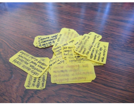 手に貼り付けている単語テープはかなりたまってきた。(もちろん、今まで貼っていたものを全て取っているわけではない)私みたいな物覚えの悪い人間 (slow learner) には最高の暗記アイテムとなる。スーパーのレジ待ちのときにちょっと見たり、便座 (toilet seat) に座りながら確認ができる。