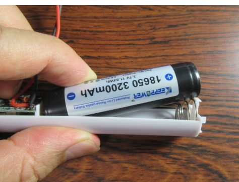 さて、一通り組み立てたところで、しっかりと動作してくれるのかどうか確認しないとならない。電池の my収納ボックスから18650の電池を取り出して、本体の白いプラスチックの収納部分 (storage space) に入れようとして「 なぬ!サ、サ、サ、サイズが… 」となってしまった。