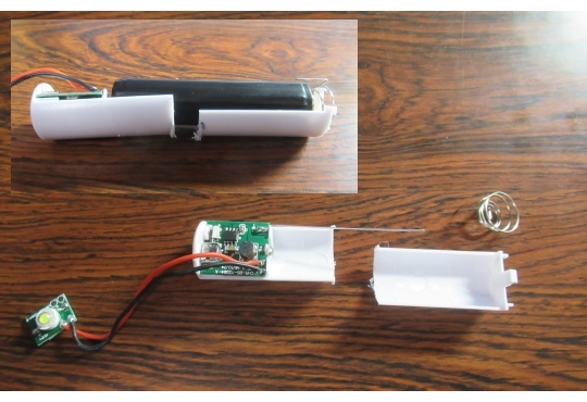基本的に「 ダメ元 」という思いがあるので、まあ、気楽にああでもないこうでもないといじることができる。そこで、まず電池が入るプラスチックを切断してみた。写真にはないが、同じように外側の筒状の (cylindrical) アルミも2つに切断した。