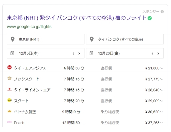 さて、「行ける」と分かったら、まずやらなければならないのは航空券の購入となる。これを行わないと次に進めない。グーグルのトップページから「 成田-バンコク 格安航空券 」で検索をすると、ページのトップにはいくつか格安航空券 (discount airplane ticket) を扱ったサイトが並んでいるが、少しページをスクロールすると、以下の料金が表示された画面がすぐに現れた。
