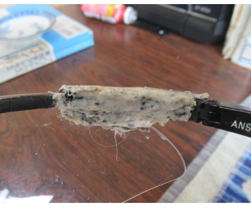・まずは別の白いプラスチックを用いて熱しながら破損した部分に乗せた。次に元々のプラスチックも溶かして乗せたプラスチックと分子間結合させる。