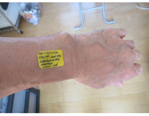 手の甲の側だと、甲に1ヶ所、そして下の写真のテープ上下に1ヶ所ずつで合計で4ヶ所。そして、手の平の側だと、手首の下あたりの2ヶ所となる。