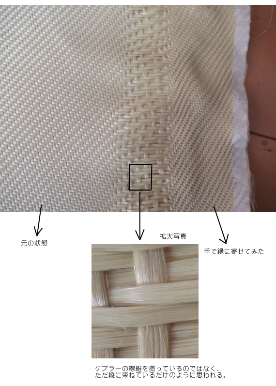 市販されているケブラー布の全てに関して言えるのかどうかは分からないが、私が購入したケブラー布は、布を織る上で最小単位となるケブラー繊維の束は撚っているわけではなく単に縦に束ねられているだけとなる。よって、一見しっかりとした生地に見えるのだが、その滑りやすさ故、簡単に縁に寄せることができる。ただ、上下の端は止められているので寄せられる幅は限られる。