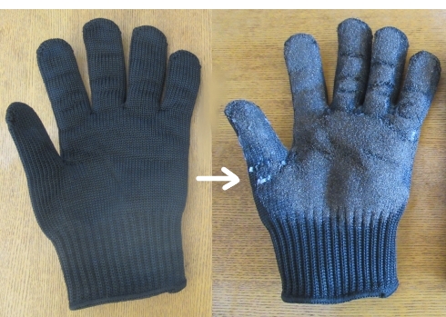 「 滑り止め (anti-slipping) 」として真っ先に頭に浮かぶのが「 シリコンコーキング材 (silicone calking material) 」である。この日記でも何回か記している。( ホームセンターなどで販売されている軍手などには、最初から黄色いドットの形でシリコンが付けられている )よって、まず掌全体に薄くシリコンコーキング材を塗布してみた。