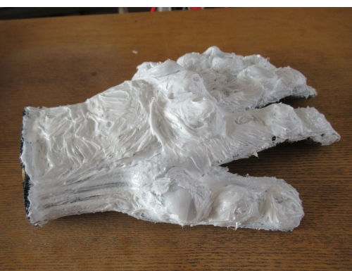 まず、拳 (fist) を作った状態で各関節および甲の部分にシリコンコーキング材を塗り衝撃吸収材(impact absorbing material) とした。続いて、軍手のときもそうだったように、各関節にはポリカプロラクトンを、そして甲の部分にはポリプロピレンを用いて耐衝撃材 (impact resistant material) とした。