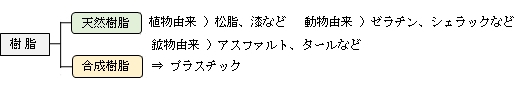 英語の「 plastic 」の日本語訳は「 合成樹脂 」となる。文字通り「(化学)合成された樹脂 」になるわけである。つまり、「 樹脂 」には天然由来のもの( 天然樹脂 )と化学合成 (chemical synthesis ) されたもの( 合成樹脂 synthetic resin )がある。そして、天然由来のものは狭義では松脂 (pine resin) や漆 (lacquer) など樹皮が分泌するものを指していたのだろうが、それに動物由来のゼラチンやカイガラムシが分泌するシェラックなどもふくめるようになったようである。ちなみにウィキペディアなどには鉱物由来のアスファルトやタールなどの名称も見られる。