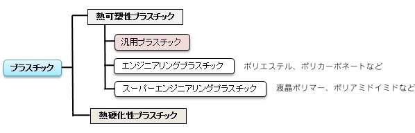 つまり、私たちが普段の生活において目にするプラスチックのそのほとんどが「 熱可塑性プラスチック 」になると思われる。それで、その「熱可塑性プラスチック」も以下のように、汎用プラスチック (commodity plastic) 、エンジニアリング・プラスチック、そしてスーパーエンジニアリング・プラスチックの3つに分類する (classify) ことができるようである。