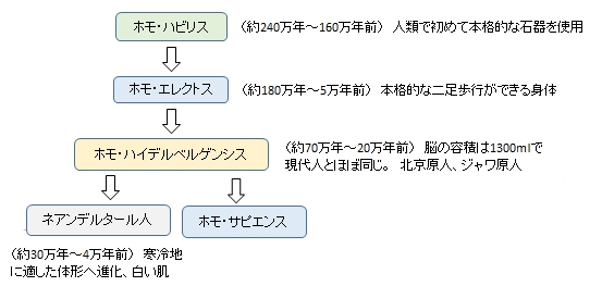 一方、誕生の地であるアフリカに残ったホモ・エレクトスの中には、頑丈な身体を維持しながら更に頭脳の容積 (capacity) を拡大していった新たな種 (species) が誕生する。それが「ホモ・ハイデルベルゲンシス」( 約70万〜20万年前 )である。のちに新人と呼ばれる「ホモ・サピエンス」と進化していく。